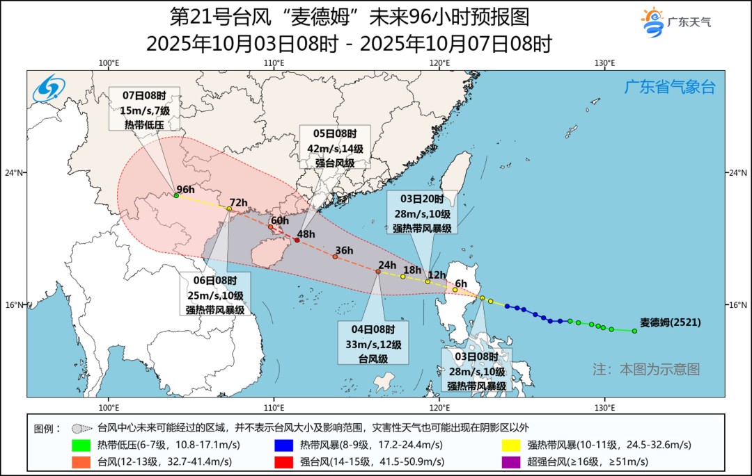 预计,“麦德姆”将以25公里左右的时速向西北方向移动,穿过菲律宾吕宋岛后于3日傍晚前后移入南海,强度逐渐加强,最强可达强台风级(14级左右,中心最低气压950百帕,12级大风半径80公里,10级大风半径120公里),5日白天在粤西到海南岛东部之间的沿海地区登陆(较大可能正面袭击雷州半岛)。