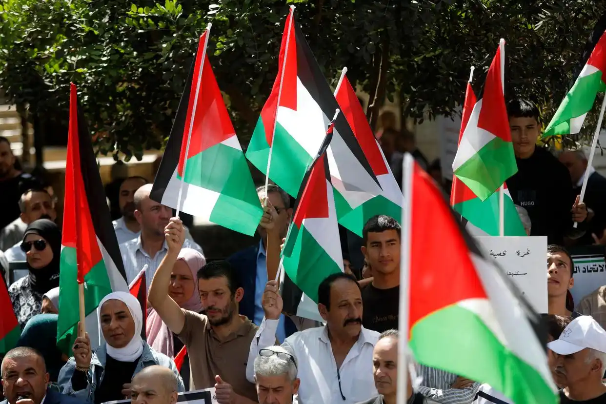 9月23日,在约旦河西岸城市希伯伦,民众挥舞巴勒斯坦旗帜参加庆祝多国承认巴勒斯坦国。新华社发(马蒙·沃兹沃兹摄) 声明强调,计划中其他关于加沙未来及巴勒斯坦人民更广泛权利的相关问题,将在巴勒斯坦民族自决框架内,根据国际法和相关国际决议予以解决。