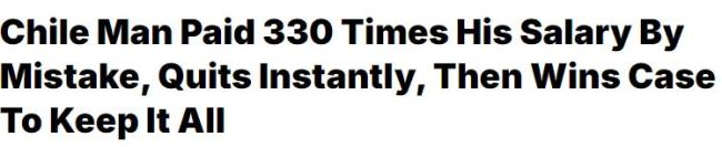 智利一公司错发330倍月薪后员工失联。有一天,你醒来发现账户里多了330倍的工资——你会怎么做?智利一名普通上班族月薪只有500美元,却在某个月工资入账时惊讶地发现账户里多了17万美元,整整是他平常薪水的330倍。更戏剧性的是,这名男子在答应“归还错误汇款”后却悄悄消失、辞职不回。公司气得提告追讨巨款,没想到三年拉锯后法院竟然判公司败诉。
