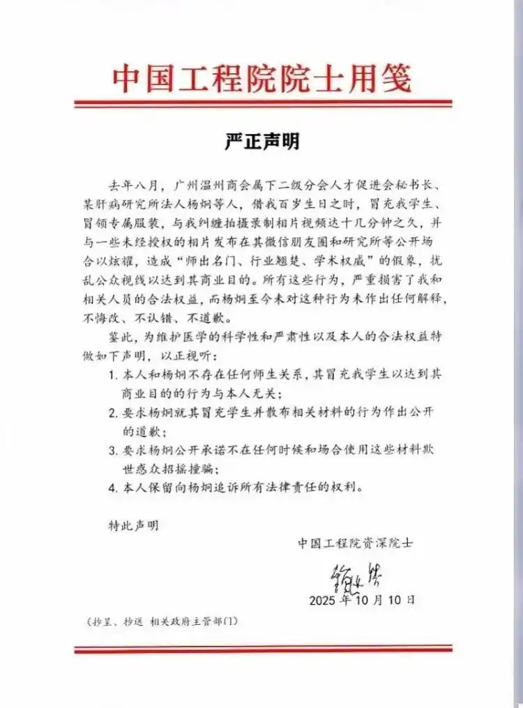 值得警惕的是,当事人蹭合照、傍名人的行为,不只是不道德。钟院士在声明中特别指出,涉事方经营肝病研究所,标注着“非医疗不含诊疗服务”,却试图利用与院士的合影进行包装。一旦此类合照被用于虚假医疗宣传,误导患者,后果恐怕不堪设想,轻则让患者蒙受经济损失,重则延误病情。