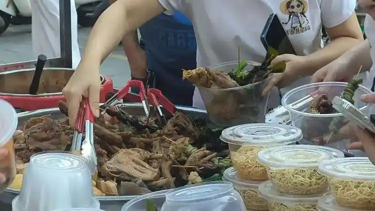 售卖期间记者几乎未找到采访机会:装菜、浇汁、打包,送到顾客手中,记者估算,平均每份用时几十秒左右,到售罄时,文女士的手几乎没停过。