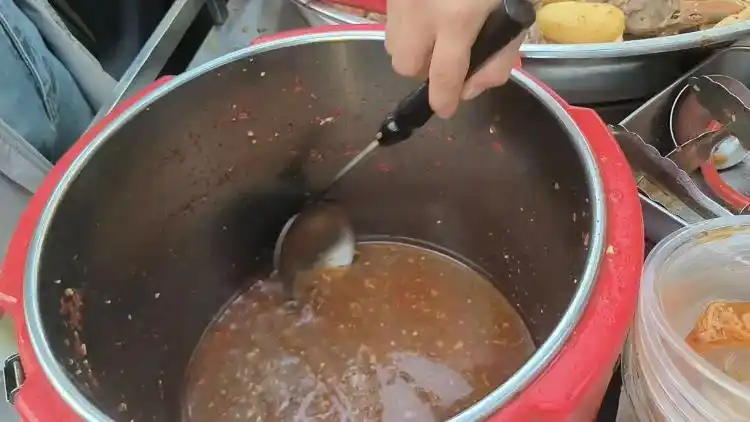 文女士在尽量刮桶底盛汤,销售后期,她多次向顾客致歉:没汤了。图/史继超摄