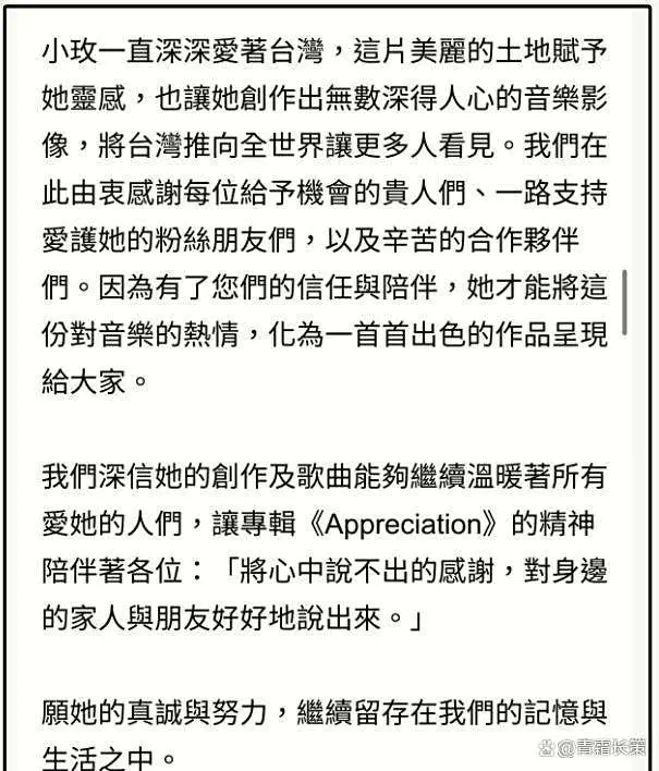 官方渠道公布了一份声明,该文件由代言人执笔,旨在告知众多粉丝及社会各界,黄小玫决定退出演艺圈这一令人惋惜的决定。
