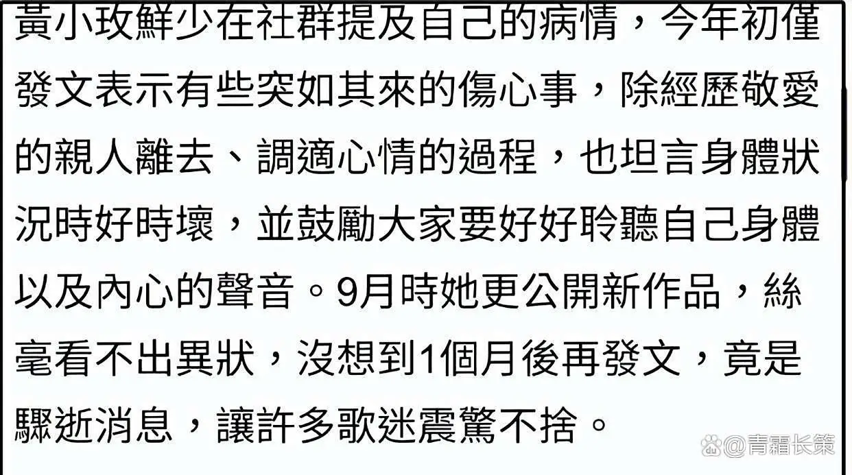 三十四岁的音乐人黄小玫去世, 外貌出众抑或学业优秀, 去月公开露面时状态正常, 尸检结果公布。