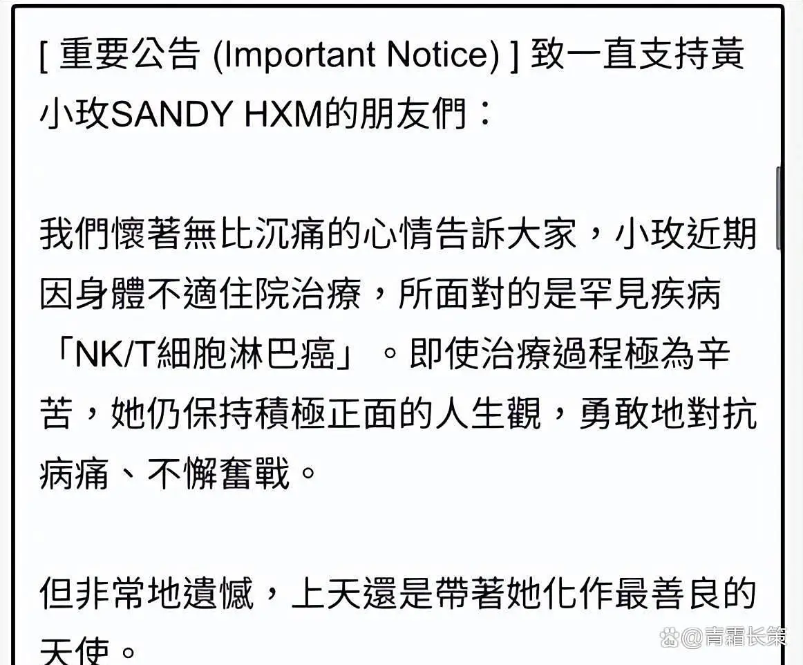 黄小玫的团队发表正式公告,证实了她离世的事宜。
