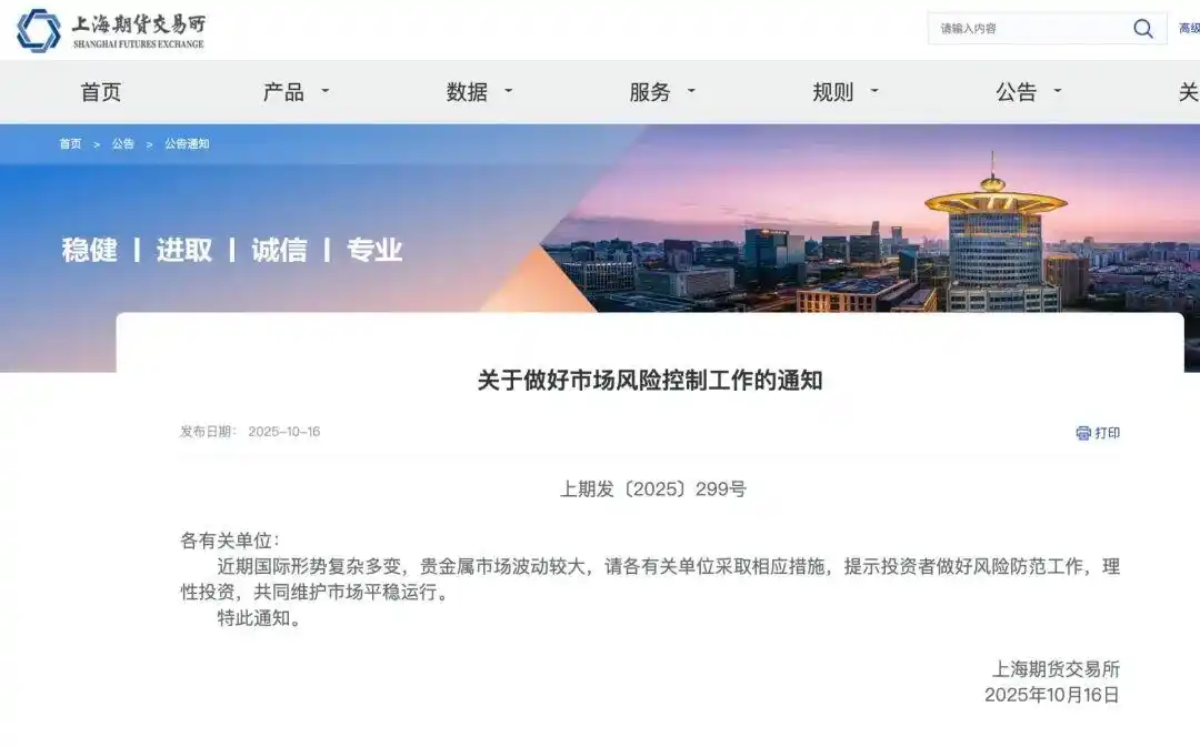 当天,上海期货交易所公布通告:当前全球局势变幻莫测,黄金和其他贵金属价格起伏剧烈,要求各相关机构实施必要对策,提醒参与者注重规避潜在风险,审慎进行资产配置,协力保障市场秩序稳定。