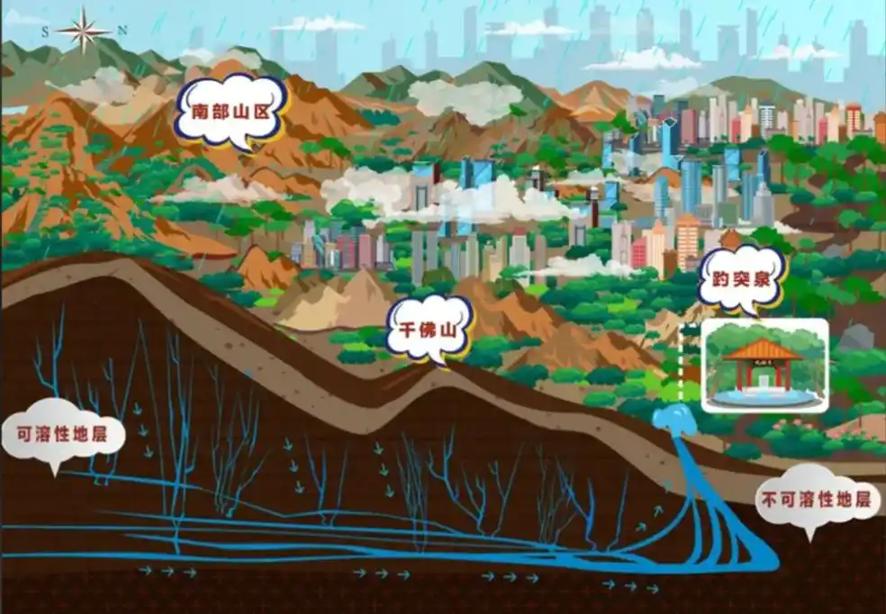 观察地质构造,这更是泉水形成的重要条件。南部山区普遍存在石灰岩,这种岩石结构松散、缝隙众多,类似“天然海绵”能够大量吸收降水,让雨水进入地下变成地下水。这些地下水在岩层的控制下,不断朝北流动,沿途经过多次净化,污物被岩层阻挡,最终流出的泉水才会纯净可口。