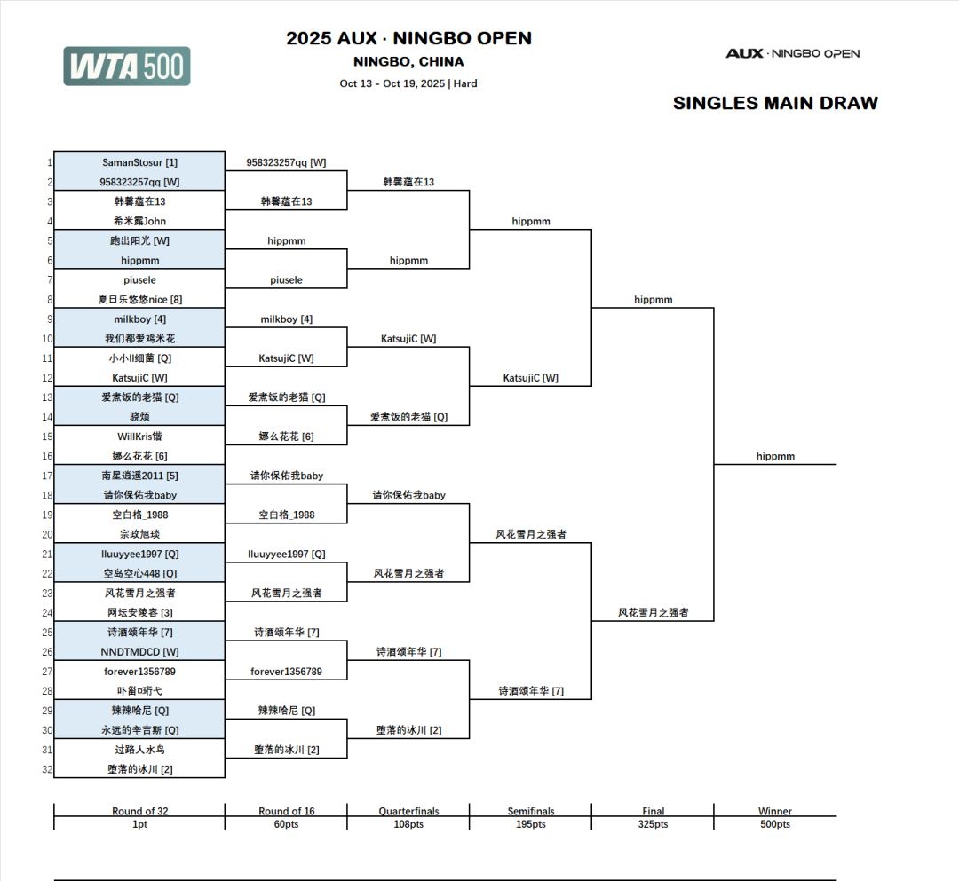 正文 「LS宁波」hippmm单打称王|风花雪月之强者/葱姜蒜瓣sky双打夺冠 KK小凯 V管理员 /10-19/17阅读/0评论 1019 文章最后更新时间2025年10月19日,若文章内容或图片失效,请留言反馈! 单打签表:双打赛场:赛会5号种子风花雪月之强者/葱姜蒜瓣sky首轮轮空后,次轮战胜空白格_1988/御剑十天,四分之一决赛淘汰堕落的冰川/辣辣哈尼。半决赛击溃双胞胎组合6号种子fandyding/kingmyskina打进决赛,最终击败8号种子我们都爱鸡米花/wang984617夺得冠军。