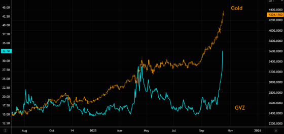 黄金波动率指数(GVZ)近期飙升至极端水平,反映出市场被迫追逐黄金的看涨期权。这种由恐慌性买盘驱动的波动率飙升,一旦情绪逆转,相关的期权头寸平仓可能会加剧价格的回调。
