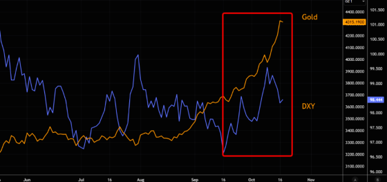 此外,自9月中旬以来,美元指数持续走高,但黄金对此似乎“视而不见”。这种脱节现象让许多依赖传统模型分析的投资者感到困惑。