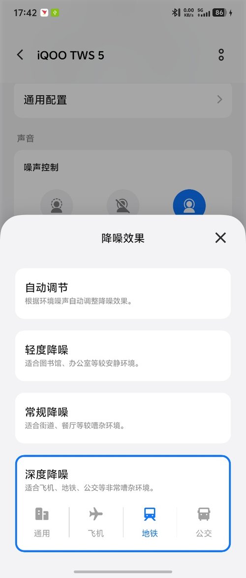 另一方面,降噪,说到底还是场景化,如果你是在安静的环境下,那基本上不需要降噪,可能通透模式更加适合,但是在地铁里、飞机上,这种噪音较大的环境下,想要很沉浸的听歌、通话,没有降噪就真的不行,所以iQOO TWS 5 的另一个特点就是 “场景化降噪” 设计。不同于传统耳机单一的降噪模式,TWS 5 专门针对飞机、地铁、公交三类高频通勤场景做了定制优化。