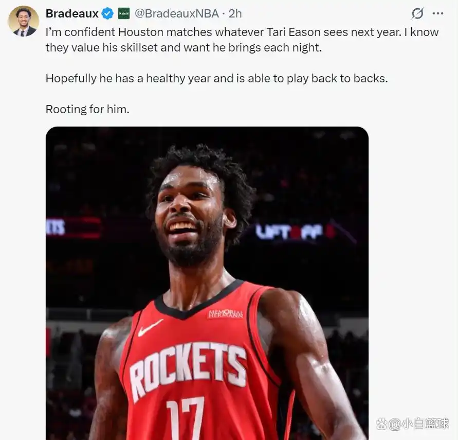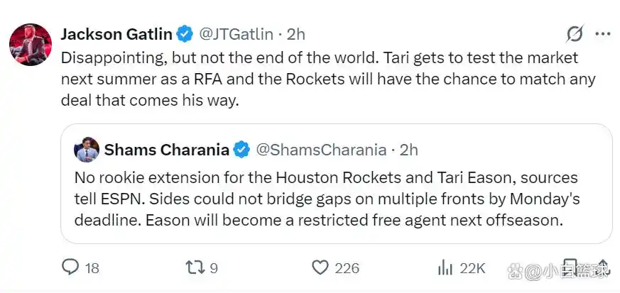 火箭队记杰克逊-加特林:火箭队续约伊森失败太令人失望了,但不是世界末日,明夏他将成为受限制的自由球员,火箭可以匹配他收到的报价。