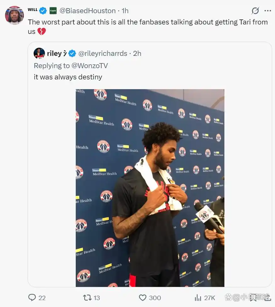 奇才媒体晒出伊森在华盛顿的采访画面,写道:这一切都是注定的。(暗示伊森会被交易)