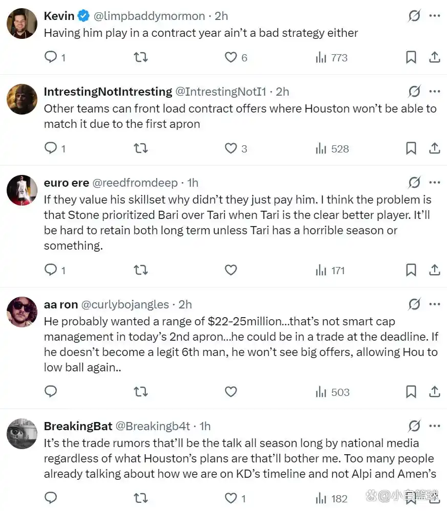 休媒热议了拉斐尔-斯通这个举动,BiasedHouston写道:人们都说杜兰特降薪是为了帮助火箭留下他们的年轻球员,这个说法我现在不认同。