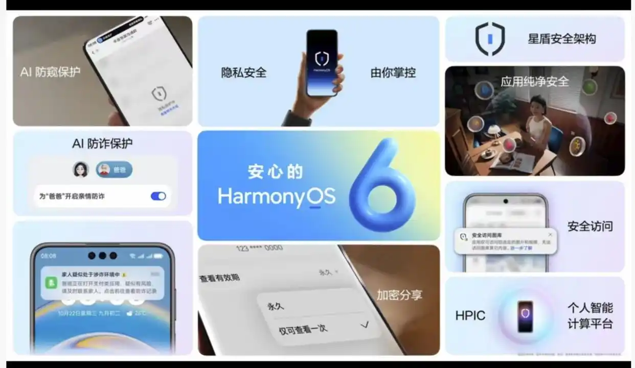 在安全方面,鸿蒙6带来了主动安全防护,星盾安全架构再升级。全新的AI防诈,支持亲情防诈,更好地帮助用户和家人防范诈骗风险。更多应用接入AI防窥能力,当旁人注视你手机时,自动隐藏应用内容,保护用户屏幕隐私。升级的加密分享功能,重要信息“仅可查看一次”,并支持加密图片、文件、音视频。