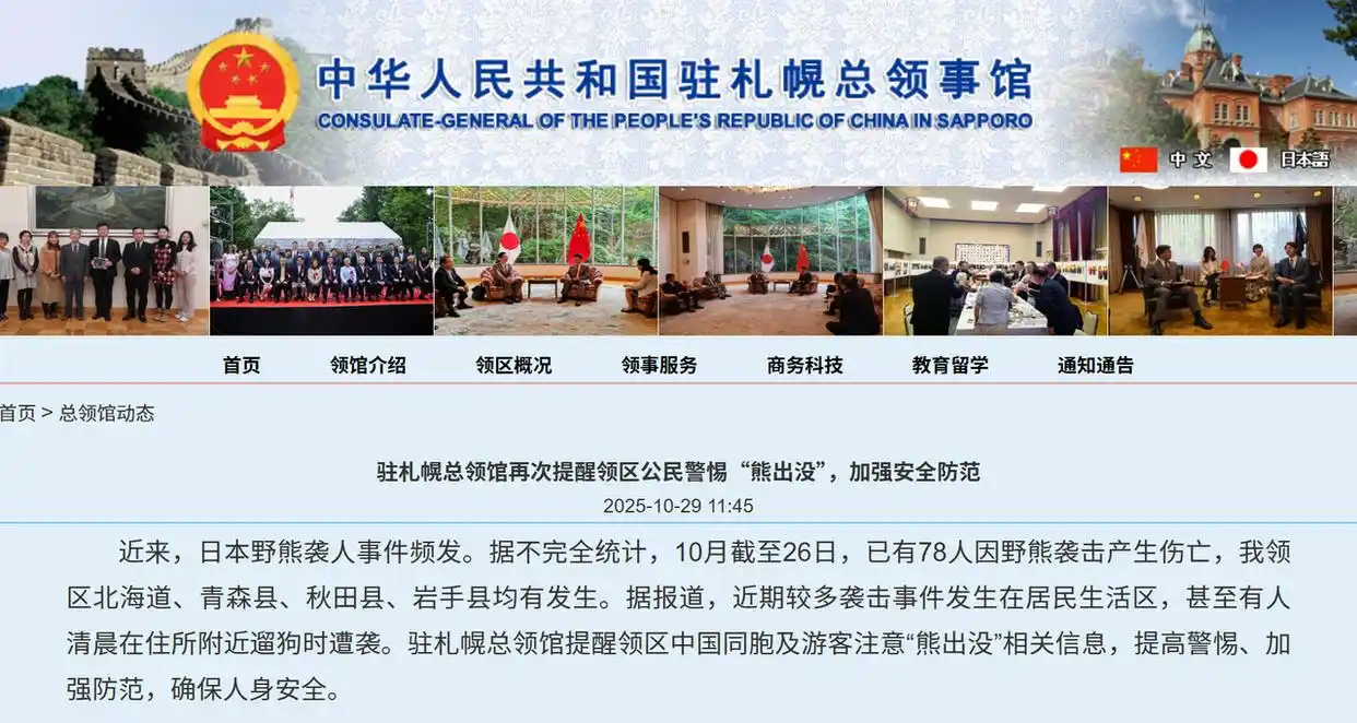 10月29日,我国驻札幌总领馆提醒领区中国同胞及游客注意“熊出没”相关信息,提高警惕、加强防范,确保人身安全。