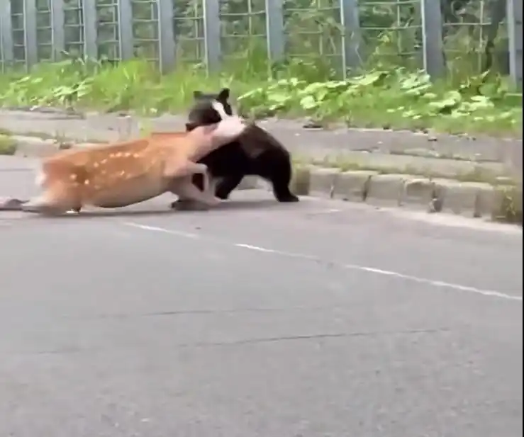 7月27日,北海道一头熊在国道上猎杀一只鹿并将其拖入草丛。图源:红星新闻
