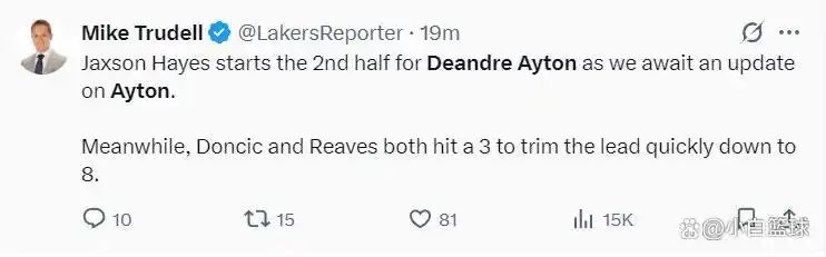 湖人队记迈克-特鲁戴尔:下半场艾顿没有先发也没有在替补席,正在等待官方消息。