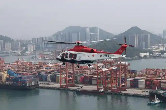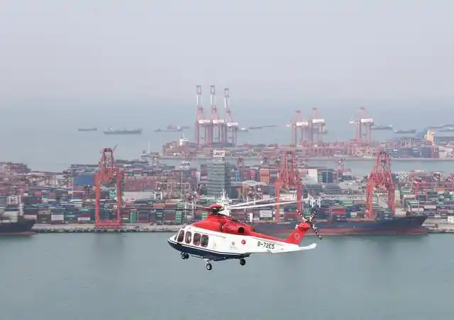 ↑ 搭载圣火的直升机进行空中传递。新华社记者 江汉 摄