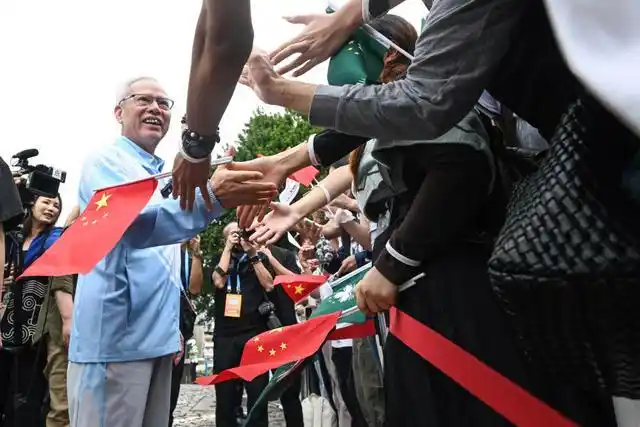 ↑ 澳门特区行政长官岑浩辉(左)在火炬传递活动中和观众握手。新华社记者 那宇奇 摄