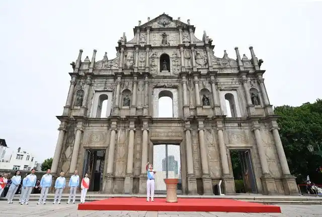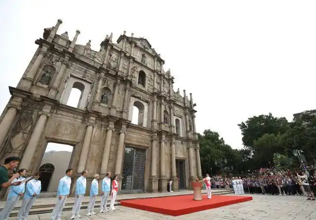 ↑ 火炬手和嘉宾在大三巴牌坊前合影。新华社发(张金加摄)