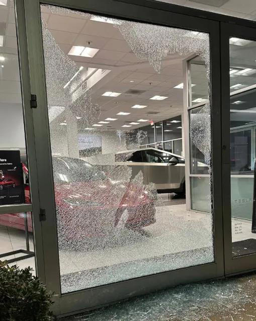 俄勒冈州塞勒姆市一家特斯拉经销商受损的橱窗。图源:美国俄勒冈州地方法院