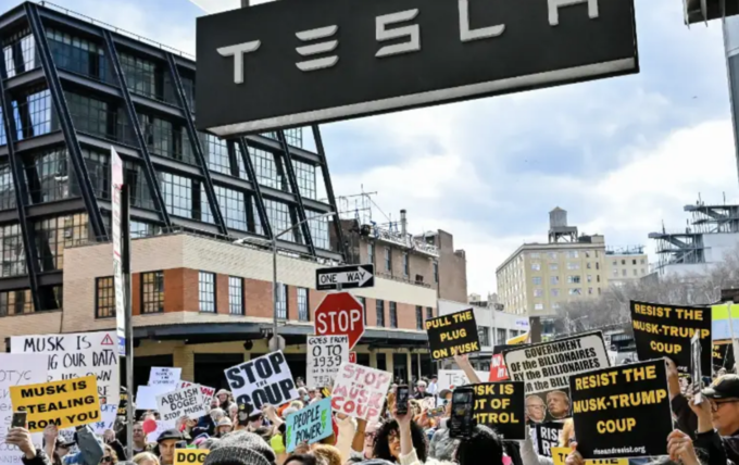 周六,在曼哈顿西村一家特斯拉展厅举行的抗议活动中,示威者高呼“没有人投票给埃隆·马斯克”和“寡头滚蛋,民主万岁”等口号。据组织者称,数百名抗议者聚集了两个小时,堵塞了入口并关闭了展厅。警方逮捕了数名示威者。