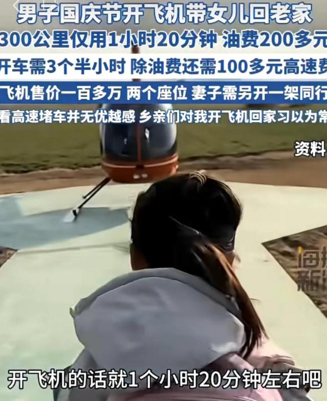 王先生表示,这几年他一直用这种方式回家,老家人也习惯了这种出行方式。对他来说,开飞机并没有优越感,只是比开车更方便。他还提到,一架飞机售价约为100万,这次国庆回家用了不到两个小时,油费仅200多元,保养费用也不高,整体花费并不大。他的女儿也在飞机上睡了一觉。