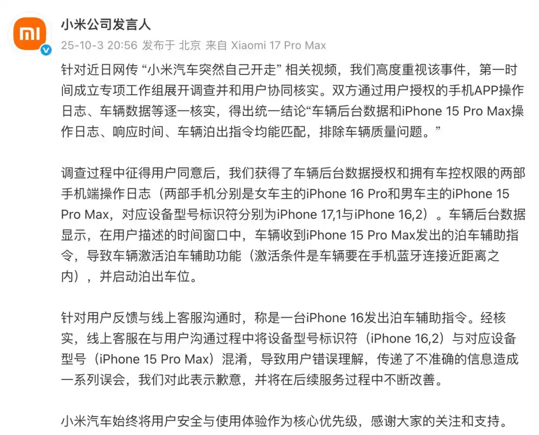 网传视频“小米汽车突然自己开走”截图调查过程中征得用户同意后,小米公司获得了车辆后台数据授权和拥有车控权限的两部手机端操作日志(两部手机分别是女车主的iPhone 16 Pro和男车主的iPhone 15 Pro Max,对应设备型号标识符分别为iPhone 17,1与iPhone 16,2)。车辆后台数据显示,在用户描述的时间窗口中,车辆收到iPhone 15 Pro Max发出的泊车辅助指令,导致车辆激活泊车辅助功能(激活条件是车辆要在手机蓝牙连接近距离之内),并启动泊出车位。针对用户反馈与线上客服沟通时,称是一台iPhone 16发出泊车辅助指令。经核实,线上客服在与用户沟通过程中将设备型号标识符(iPhone 16,2)与对应设备型号(iPhone 15 Pro Max)混淆,导致用户错误理解,传递了不准确的信息造成一系列误会,小米称对此表示歉意,并将在后续服务过程中不断改善。小米汽车始终将用户安全与使用体验作为核心优先级,感谢大家的关注和支持。