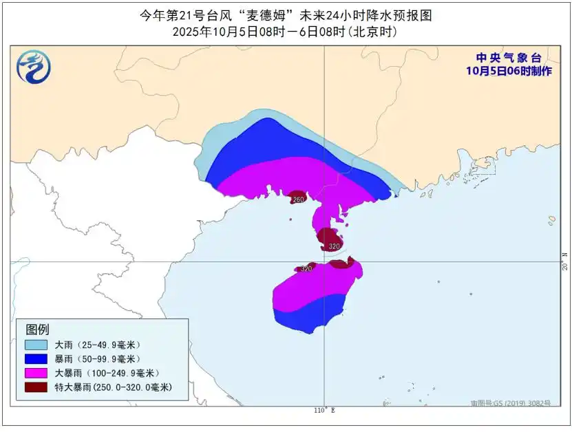 降水预报:10月5日8时至6日8时,海南岛大部、广东西南部、广西南部等地部分地区有暴雨到大暴雨,局地特大暴雨(250~320毫米)。