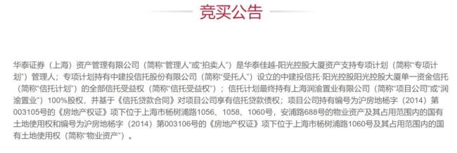 物业资产的处置方是华泰证券(上海)资产管理有限公司,该公司是“华泰佳越-阳光控股大厦资产支持专项计划”的管理人。物业资产标的所涉及的债务人为上海润渝置业有限公司和上海臻德房地产开发有限公司,所涉债权初始金额为9.33亿元;债权人则为中建投信托股份有限公司。