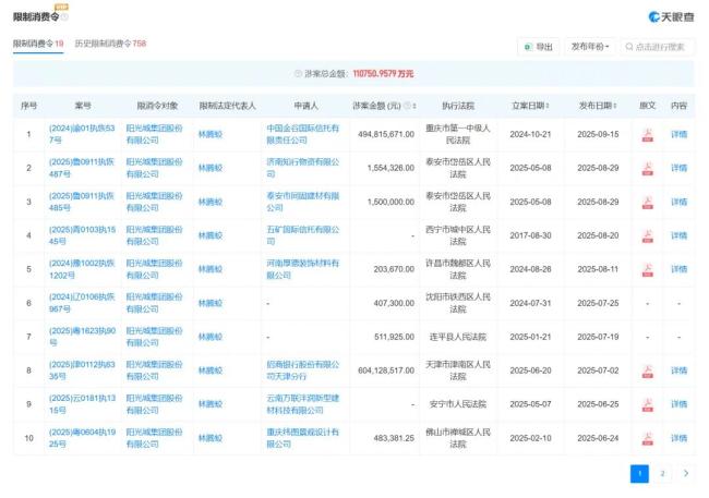 此外,上海润渝置业有限公司向阳光城及其相关公司提起诉讼,要求支付2022年1月1日至2023年7月8日的租金、物业费、停车费,合计1.81亿元。法院判决阳光城及其相关公司支付租金及违约金,并归还租赁房屋。