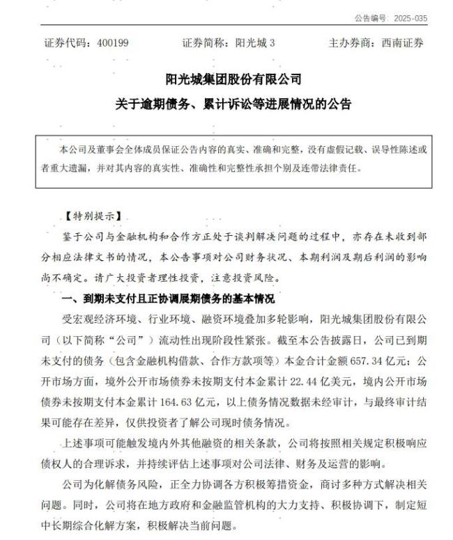 2024年3月,阳光城创始人林腾蛟卸任法定代表人、董事长,朱荣斌卸任总经理,施志敏接任法定代表人、董事长、总经理。目前,阳光城仍深陷债务泥潭。截至2024年9月25日,阳光城已到期未支付的债务本金合计金额657.34亿元,境外公开市场债券未按期支付本金累计22.44亿美元,境内公开市场债券未按期支付本金累计164.63亿元。