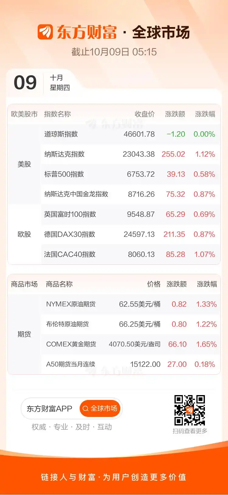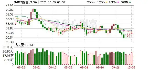 商品市场:国际油价10月08日上涨。截至当天收盘,纽约商品交易所WTI原油期货当月连续合约结算价上涨0.82美元,收于每桶62.55美元,涨幅为1.33%;伦敦布伦特原油期货当月连续合约上涨0.80美元,收于每桶66.25美元,涨幅为1.22%。国际金价突破4000美元大关,现货黄金涨1.44%,报4042.14美元/盎司。COMEX黄金期货当月连续合约上涨66.10美元,涨幅1.65%,报4070.5美元/盎司。