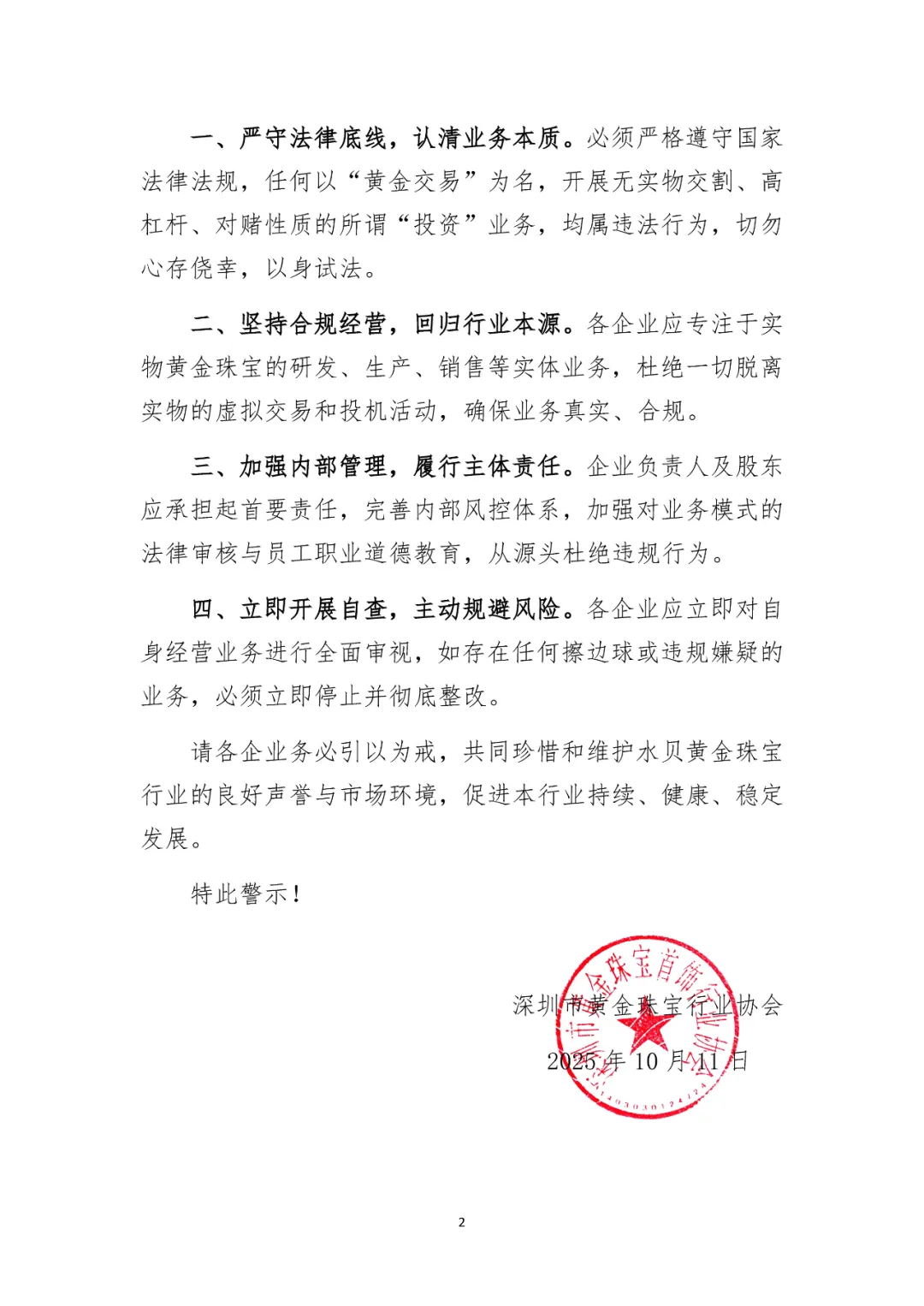 警示函提到,“近期我们依然遗憾地注意到司法机关在我市水贝片区相继查处了三家黄金珠宝公司。经查,这些公司以经营黄金为名,实际通过线上平台开展‘非实物黄金对赌’业务,其行为已涉嫌构成开设赌场罪。目前,相关公司负责人及骨干成员已被依法采取刑事强制措施,涉案人员将面临严重的法律后果。这些案件暴露出,个别企业为牟取非法利益,打着实物黄金交易的幌子,诱导客户进行高杠杆的‘买涨买跌’对赌交易,其业务实质已完全脱离黄金珠宝行业的正常经营范围,严重扰乱市场秩序,玷污行业声誉。”