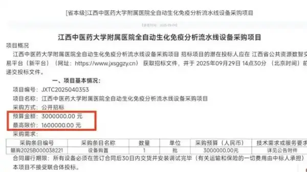 近日,江西一则中标结果公示引发关注:江西中医药大学附属医院全自动生化免疫分析流水线设备采购项目预算300万元,但中标价格仅1000元。