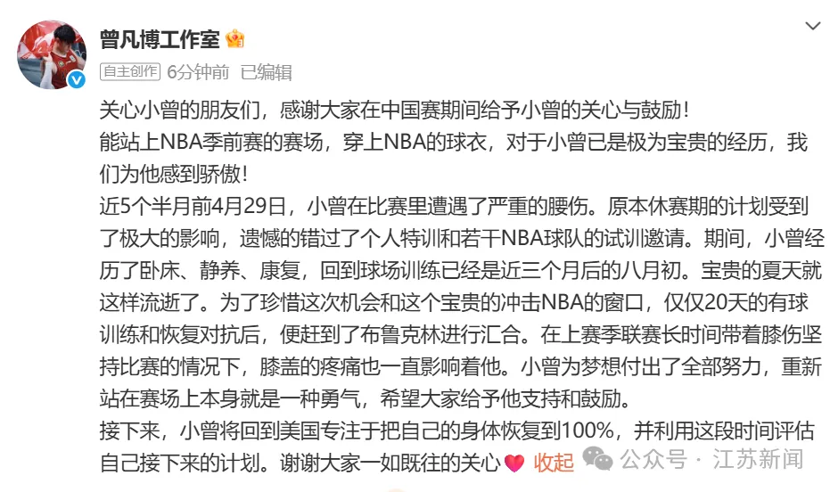 近5个半月前4月29日,小曾在比赛里遭遇了严重的腰伤。原本休赛期的计划受到了极大的影响,遗憾的错过了个人特训和若干NBA球队的试训邀请。期间,小曾经历了卧床、静养、康复,回到球场训练已经是近三个月后的八月初。宝贵的夏天就这样流逝了。为了珍惜这次机会和这个宝贵的冲击NBA的窗口,仅仅20天的有球训练和恢复对抗后,便赶到了布鲁克林进行汇合。在上赛季联赛长时间带着膝伤坚持比赛的情况下,膝盖的疼痛也一直影响着他。小曾为梦想付出了全部努力,重新站在赛场上本身就是一种勇气,希望大家给予他支持和鼓励。
