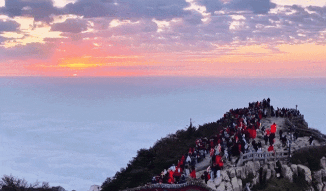 泰山在秋日时,呈现出层林尽都被染上色彩的景致,凌晨四点的时候,玉皇顶那里,就是海拔1545米的那个地方,已经聚集了好多游客,在破晓之前,天际那边,自黛青逐渐转变为橘红,一瞬间,一轮红日从云海之中跳跃出来,金光马上就洒满了群峰,泰山景区的工作人员进行介绍,今年国庆期间,每天观看日出的游客数量大概是8000人,景区采取分时段进行预约的措施,用来确保游客的安全。