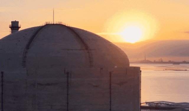 太阳从海平面升起,清晨六点,朝霞把福建东山湾海域的天空染成粉金色,给漳州核电“华龙一号”核电机组披上金色外衣,这里是国家重大核电项目基地,有两台“华龙一号”机组正在建设,工程部经理站在观景台上,注视着晨光里的建设现场,向记者介绍工程进展。