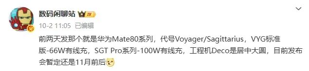 苹果和安卓阵营的一系列母品牌都发布了新的旗舰,而就在近期华为新旗舰Mate80系列的消息也在大量出现。根据目前的已经确定的时间来看,华为将在10月22日正式发布鸿蒙6,央视新闻也在近日宣布将在11月28日举行大型直播晚会《鸿蒙星光盛典》,但并未表明此次活动的具体内容。根据两个时间节点来看,华为Mate80系列就将在11月亮相,至于是否为11月末仍需进一步确认。据月初@数码闲聊站 爆料,华为Mate80系列发布会暂定还是11月前后。爆料显示,此次新机代号Voyager/Sagittarius,VYG标准版-66W有线充,SGT Pro系列-100W有线充,工程机Deco是居中大圆,条形双色温闪光灯大概是镜头左上侧,右上侧对称条形传感器,中轴下有一颗多光谱镜头。也就是说,在月初的爆料,华为Mate80系列有两个版本,也就是标准版和Pro版,并且仍旧采用居中大圆的后摄方案。而后在月中,该博主就爆料了华为Mate80 Pro+的相关消息:就在今日,博主@数码闲聊站 曝光了华为Mate 80 Pro系列样机备案颜色:AL00 系列包含黑、白、金、青四种配色,AL10 系列则是黑、白、金、紫、青、银六种配色。此外,该机型还提供素皮保护壳 + 磁吸支架保护壳,将支持磁吸生态。另外,参考博主@厂长是关同学 以往的爆料来看,华为Mate80也是小直屏,Mate80 Pro以上版本延续使用等深四微曲,但与此前其他爆料的全系直屏有出入,还需要等待进一步的确认。这一代的Mate80系列性能提升一截,新版本系统加速完善生态体验,主流APP使用体验会提升很多。影像部分据说有不小惊喜。以往的消息显示,华为Mate 80系列将首发全新的麒麟9030芯片。按照爆料中的说法,其性能将提升20%。华为Mate80系列还配备了风扇。散热风扇集成在大圆Deco下半部分,高速小型风扇+风道+鳍片做了小型化精密封装+防水结构,出风口在Deco侧边。这将进一步提升麒麟芯片的性能上限。虽然依旧采用了圆形Deco的设计,但结合多方的爆料来看,今年的Mate80系列无论是在芯片性能和性能释放环境方面都下了不少功夫,预计会带来超出预想的提升。